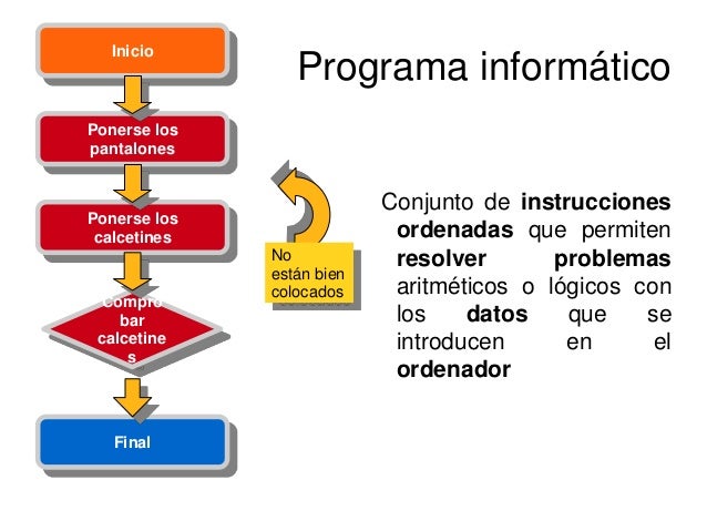 - 4. Programa informático Conjunto de instrucciones ordenadas que permiten resolver problemas aritméticos o lógicos con los datos que se introducen en el ordenador Inicio Ponerse los pantalones Ponerse los calcetines Compro bar calcetine s No están bien colocados Final