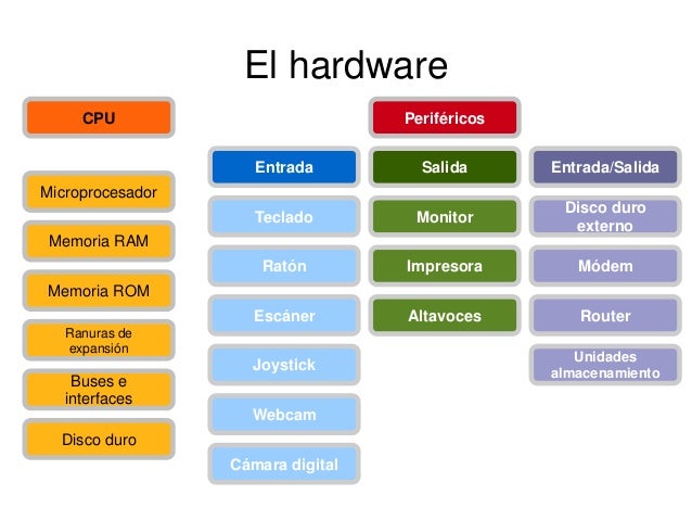 - 6. El hardware CPU Periféricos Microprocesador Memoria RAM Memoria ROM Ranuras de expansión Buses e interfaces Disco duro Entrada Salida Entrada/Salida Teclado Ratón Escáner Joystick Webcam Cámara digital Disco duro externo Módem Router Unidades almacenamiento Monitor Impresora Altavoces