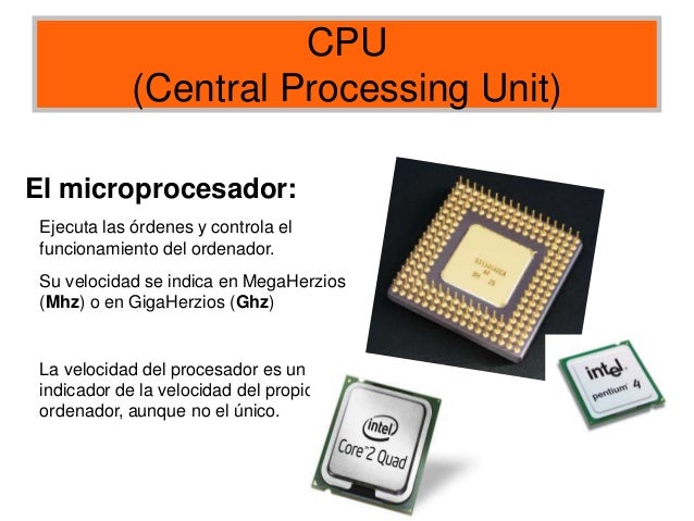 - 7. CPU (Central Processing Unit) El microprocesador: Ejecuta las órdenes y controla el funcionamiento del ordenador. Su velocidad se indica en MegaHerzios (Mhz) o en GigaHerzios (Ghz) La velocidad del procesador es un indicador de la velocidad del propio ordenador, aunque no el único.